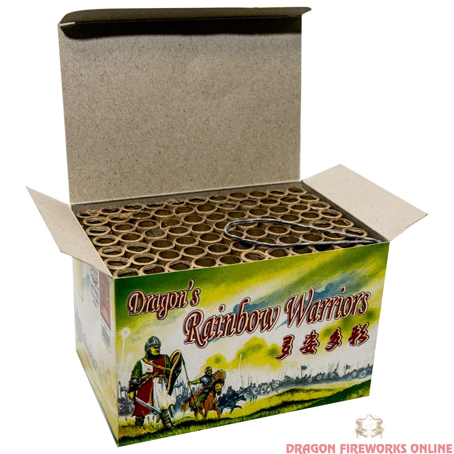 77 shots of multicolored rainbow peony stars with crackling tails.